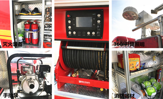 消防車標配:空氣泡沫槍、消防吸水管、濾水器、分水器、集水器、消防水帶、水帶掛鉤、水帶包布、異徑接口、同型接口、直流水槍、開花水槍、直流開關水槍、消防鎬、地上扳手、地下扳手、吸水管扳手、水帶護橋、泡沫器吸液管、腰斧、消防斧、鐵鍬、撬扛等。
